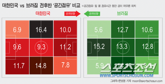 볼이 머문 시간을 분석하는 공간 점유에선 브라질은 최전방 중앙(15.2%)에서 가장 많은 플레이를 펼쳤다. 한국은 미드필드 왼쪽(16.4%)과 오른쪽(14.8%)에서 긴 시간을 머물렀다. 데이터에서도 한국은 브라질의 적수가 아니었다. 김성원 기자 newsme@sportschosun.com