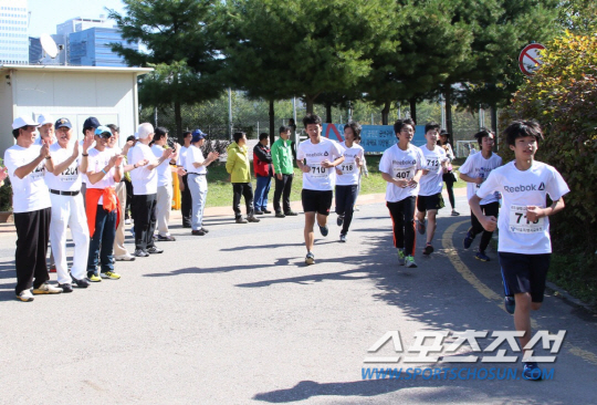 ◇12일 서울시 상암월드컵공원 내 난지공원에서 펼쳐진 제1회 서울특별시 교육감배 중학생 건강달리기 대회에서 각 학교를 대표해 출전한 중학교 2학년생들이 뜨거운 레이스를 펼쳤다. 문용린 서울특별시교육감과 '마라톤 영웅' 이봉주가 박수를 치며 파이팅을 독려했다. 사진제공=서울특별시교육청
