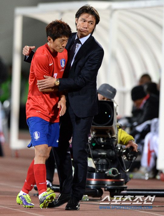 홍명보 감독이 이끄는 축구대표팀이 15일 천안종합운동장에서 말리와 친선경기를 가졌다. 홍명보 감독이 후반 교체된 이청용을 격려하고 있다. 천안=허상욱 기자 wook@sportschosun.com/2013.10.15/