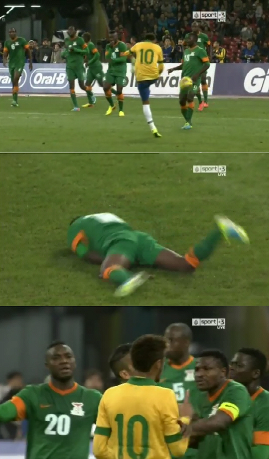 잠비아 선수들은 네이마르가 비신사적인 행위를 했다면서 네이마르에게 달려와 격렬하게 항의했다.