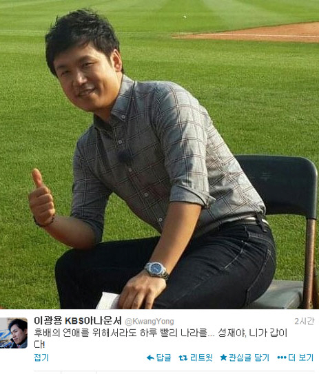 이광용 아나운서는 16일 자신의 트위터에 "후배의 연애를 위해서라도 하루 빨리 나라를. 성재야, 네가 갑이다!"라는 글을 게재했다.