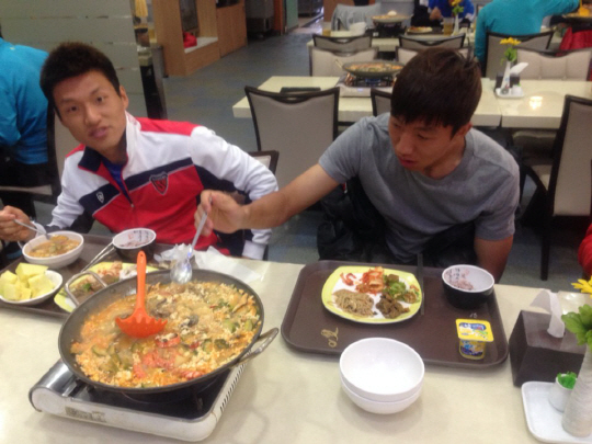 ◇포항 이명주(왼쪽)와 고무열이 17일 포항 송라클럽하우스에서 제공된 전복전골을 먹으며 즐거운 표정을 짓고 있다. 사진제공=포항 스틸러스