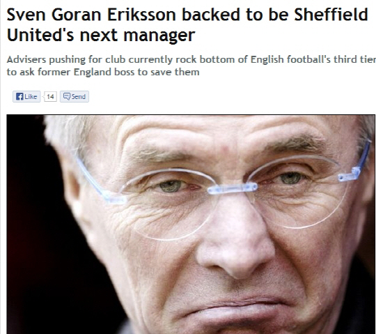 17일(한국시각) 영국 일간지 데일리미러는 셰필드 유나이티드의 새로운 아랍출신의 주주가 에릭손을 원한다고 보도했다. 셰필드는 올시즌 11경기에서 단 1승에 그치며 승점 5점을 얻는데 그쳤다. 에릭손은 현재 중국의 광저우 R&F의 고문으로 일하고 있다. 에릭손은 재정지원만 확실히 이루어진다면 감독직 복귀를 할 수 있다는 입장이다.