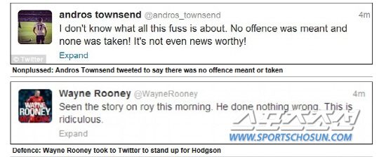 때아닌 인종차별 논란에 휩싸인 호지슨 잉글랜드 감독을 옹호하는 타운센드와 웨인루니의 트위터.