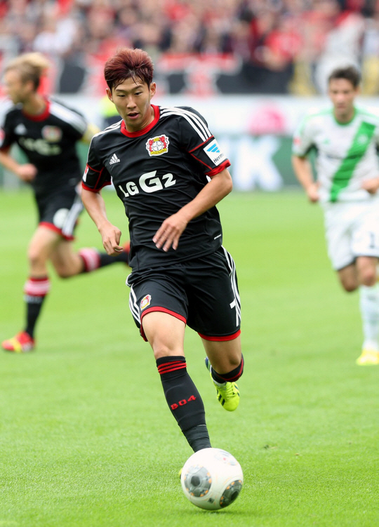 14일 독일 레버쿠젠 바이아레나에서 레버쿠젠과 볼프스부르크와의 분데스리가 5라운드 경기가 열렸다. 레버쿠젠이 3대1로 이겼다. 손흥민이 드리블하고 있다. 사진제공=LG전자
