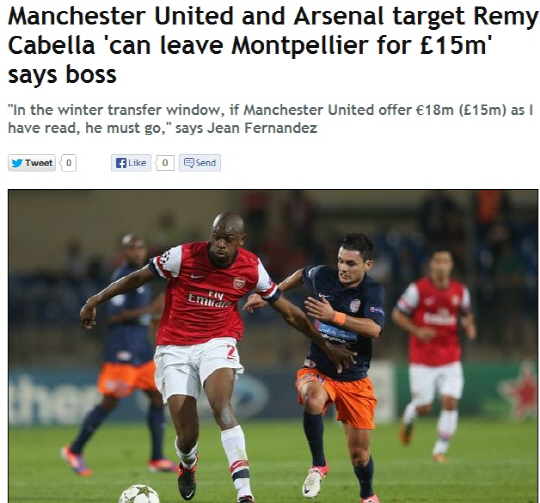 레미 카벨라(몽펠리에)의 몸값 가이드라인이 정해졌다. 몽펠리에 유스 출신의 카벨라는 비슷한 플레이스타일로 '제2의 지단'으로 불리고 있다. 카벨라는 올시즌 5골-2도움을 기록 중이다. 맨유와 아스널이 적극적인 러브콜을 보내고 있다. 특히 창조적 미드필더의 부재로 고생하고 있는 맨유는 1월이적시장에서 카벨라의 영입을 노리고 있다. 장 페르난데스 몽펠리에 감독은 20일(한국시각) 통신사 로이터와의 인터뷰에서 "겨울이적시장에서 맨유가 1500만파운드를 제시한다면, 카벨라는 이적할 수 밖에 없다"며 "카벨라가 떠난다면 팀이 망가질 수 있지만, 1500만파운드의 제안을 거절하기 어렵다"고 했다. 카벨라 역시 프랑스풋볼과의 인터뷰에서 "유럽챔피언스리그에서 뛰고 싶다"며 이적을 원하고 있다.