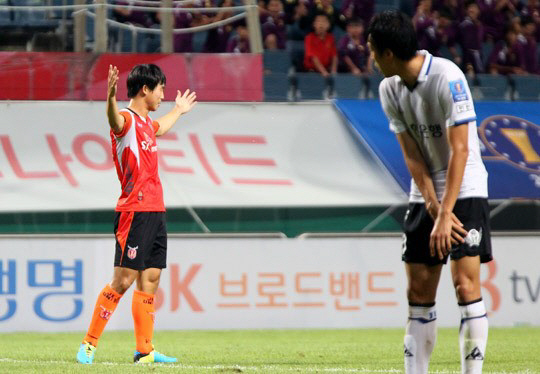 박경훈 제주 유나이티드 감독이 대전 시티즌전에서 페널티킥을 실축한 윤빛가람(23)을 독려했다.