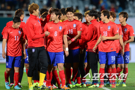 ◇지난 15일 천안종합운동장에서 열린 말리와의 친선경기에 나선 A대표팀 선수단. 천안=정재근기자 cjg@sportschosun.com