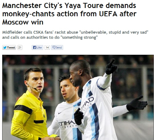 맨시티는 24일(한국시각) 러시아 모스크바의 킴키 아레나에서 CSKA모스크바와 2013~2014시즌 유럽챔피언스리그 경기를 치렀다. 경기는 맨시티의 2대1로 끝이났다. 문제는 경기 도중 나타났다. CSKA모스크바의 서포터스가 투레를 향해 원숭이 소리를 내며 자극한 것. 소리를 들은 투레는 곧장 심판에게 가서 항의했다. 분이 풀리지 않은 그는 경기후 인터뷰에서 실망감을 표시했다.