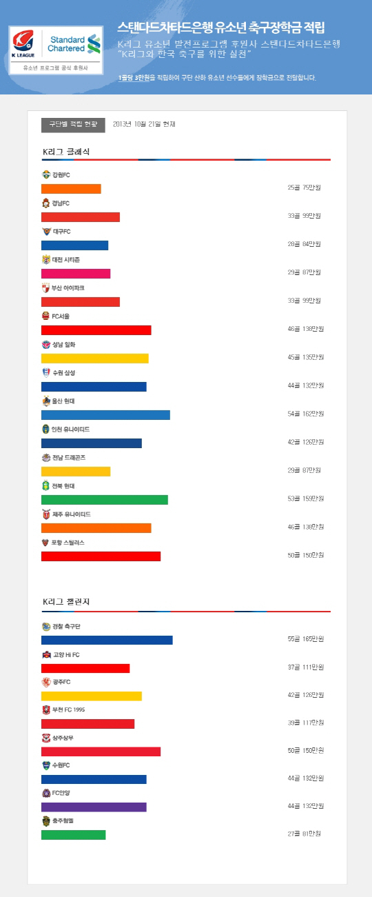 K-리그 유소년 축구 발전 프로그램 후원사인 스탠다드차타드은행이 K-리그와 손잡고 2011년과 2012년에 이어 3년 연속 '스탠다드차타드은행 유소년 축구 장학금 적립' 프로그램을 진행한다.