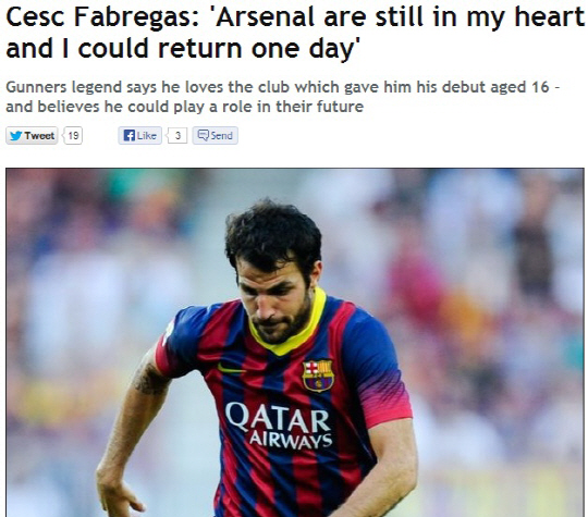세스크 파브레가스(바르셀로나)가 친정팀에 대한 애정을 드러냈다. 파브레가스는 아스널의 주장으로 212경기에서 나서 35골을 기록한 레전드 미드필더다. 파브레가스는 25일(한국시각) 영국 일간지 가디언과의 인터뷰를 통해 아스널 시절에 대한 속시원한 얘기를 털어놨다. 그는 특히 2008년 선두를 질주하다 에두아르도의 부상과 동시에 팀이 추락한 것과, 2011년 칼링컵 결승에서 무너진 것이 가장 아쉬운 순간이라고 했다. 파브레가스는 자신의 이적 후 득점포를 폭발시킨 로빈 판 페르시가 완벽할때 함께 호흡하지 못한 것에 대한 아쉬움을 드러내는가 하면, 스페인 프리메라리가 출신 선수들이 잉글랜드 프리미어리그에서 빠르게 적응할 수 있는 이유에 대해서 설명하기도 했다. 파브레가스는 "다비드 실바나 메주트 외칠 같은 스페인 스타일의 선수들은 공간이 많기 때문에 생각할 시간만 있으면 패스하기에 수월하다. 스페인에서는 공간을 줄이려는 것에 초점을 맞춰 바로 패스하기가 어렵다"고 했다.