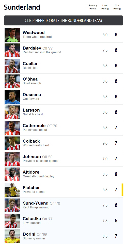 이날 풀타임을 소화하며 보리니의 결승골을 도운 미국대표팀 출신 공격수 알티도어가 최고평점 8점을 받았다. 스카이스포츠는 '모든 면에서 위대했다( Great all-round disaplay)'고 극찬했다. 후반 39분 짜릿한 결승골로 선덜랜드의 시즌 첫승을 이끈 보리니는 '깜짝 놀랄 만큼 충격적인 승자(Stunning winner)'라는 평가와 함께 승점 7점을 받아들었다. 전반 5분 첫골을 터뜨린 플레처 역시 '파워풀한 선제골'이라는 평가로 평점 7점을 받았다. 놀라운 활동량을 보여준 잭 콜백과 날카로운 크로스로 선제골을 도운 아담 존슨도 각각 '정말 열심히 뛰었다' '선제골을 도운 크로스'라는 평가로 나란히 평점 7점을 받았다.