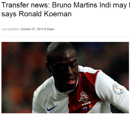 페예노르트와 네덜란드의 수비수 브루노 마르틴스 인디의 잉글랜드 프리미어리그(EPL) 진출이 가속화되는 분위기다.