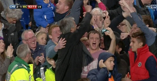 28일(한국시각) 첼시는 맨시티와의 잉글랜드프리미어리그 10라운드 홈경기에서 후반 45분 토레스의 결승골에 힘입어 2대1로 승리했다. 맨시티 수비수 나스타시티와 조 하트의 실수를 틈탄 '극장'같은 결승골은 짜릿했다. 무리뉴는 자신의 경기를 지켜보고 있던 아들과 기쁨을 나누기 위해 맨시티 관중석으로 난입했다. 맨앞줄 첼시팬들과 포옹했다. 무리뉴가 관중석으로 들어오는 순간 팬들은 스마트폰 카메라를 꺼내들고 인증샷 찍기에 몰입했다. 첼시팬들에게 남다른 추억을 선사한 셈이 됐다.