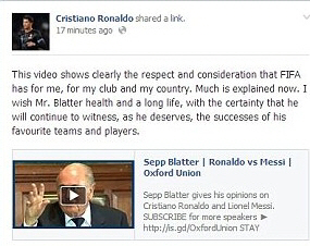 호날두는 "그가 좋아하는 팀, 선수들의 성공과 함께 블래터 회장님이 앞으로도 쭉 건강하고 장수하시길 빈다"는 삐딱한 코멘트도 덧붙였다.