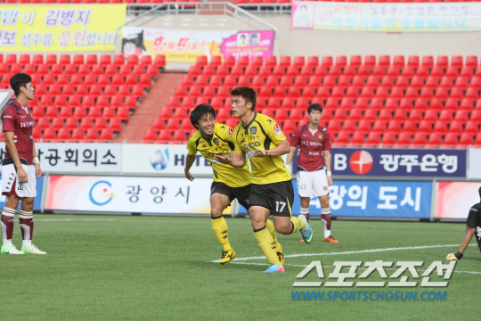 ◇올시즌 6골 4도움을 기록한 이종호는 팀 플레이어다. 심동운 전현철 등 23세 이하 공격라인은 도음을 주고받으며 올시즌 5골 이상을 기록했다. 이종호가 지난 22일 대전전에서 선제골을 넣은 직후 심동운과 함께 기뻐하고 있다. 사진 제공=전남 드래곤즈 구단
