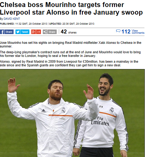 최근 레알 마드리드에서 입지가 줄어든 알론소는 친정팀 복귀에 많은 관심을 갖고 있다. 지난시즌까지 알론소와 함께 했던 조제 무리뉴 감독이 이끄는 첼시도 알론소 영입에 러브콜을 보내고 있지만, 알론소의 행선지는 리버풀 쪽에 가까운 것으로 보인다.