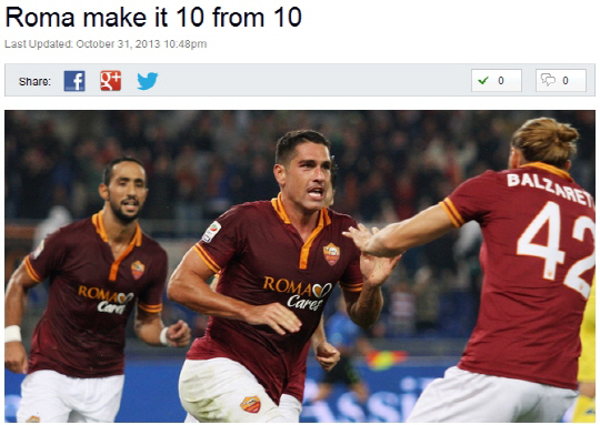 AS로마는 1일 오전(한국시간) 이탈리아 로마 올림피코 스타디움에서 열린 2013~2014시즌 이탈리아 세리에A 10라운드 키에보와의 경기에서 보리엘로의 결승골에 힘입어 1대0으로 승리를 거뒀다. 벌써 리그 10연승이다. 지난 우디네세전에서 세리에A 개막 후 최다연승 신기록을 세운 AS로마는 다시 한번 역사를 새로 써내려갔다.