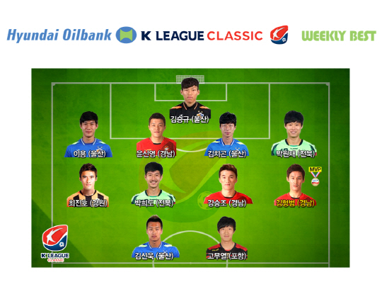 베스트11 공격진에는 김신욱(울산)과 고무열(포항)이 이름을 올렸다. 김신욱은 시즌 18호골로 페드로(제주)를 제치고 득점 단독 선두에 나섰다. 미드필더에서는 김형범을 포함해 강승조(경남) 박희도(전북) 최진호(강원)이 한 자리씩 차지했다. 수비수에는 박원재(전북) 윤신영(경남) 김치곤 이 용(이상 울산)이 선정됐다. 최고 골키퍼는 김승규(울산)의 몫이었다.