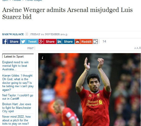 올시즌 프리미어리그 선두에 올라있는 아스날은 3일 리버풀과 정규리그 10라운드를 치른다.