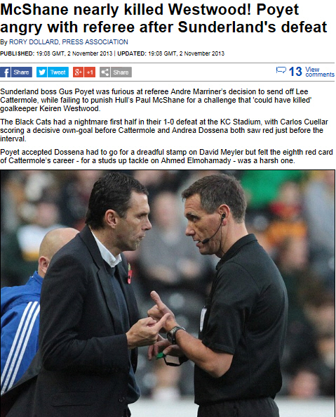악몽같은 전반전, 그리고 심판 판정에 대한 아쉬움 때문이다. 선덜랜드는 3일(한국시각) 열린 헐시티와의 EPL 10라운드에서 0대1로 패했다. 경기 초반 팽팽하게 접전을 펼치던 두 팀의 경기는 전반 종료 직전 급격하게 헐시티쪽으로 기울었다. 전반 25분 케야르의 자책골로 0-1의 리드를 내준 선덜랜드는 전반 43분 골키퍼 웨스트우드를 빼야 했다. 헐시티 공격수 폴 맥셰인과의 볼 경합 과정에서 강하게 몸을 부딪혔고 그 충격으로 교체 아웃됐다. 웨스트우드의 골키퍼 장갑은 마노네가 꼈다. 그런데 분위기가 이상하게 흘러가기 시작했다. 전반 추가시간에 캐터몰과 도세나가 모두 퇴장 당하는 초유의 사태가 발생했다. 전반 48분에는 캐터몰이 엘 모하마디에게 강한 태클을 들어가 바로 레드 카드를 받았고 2분 뒤에는 보세나가 메일러의 발목을 강하게 밟은 뒤 다시 그라운드를 떠났다. 골키퍼의 부상 교체와 두 장의 레드 카드가 나오는데 7분이 걸린 보기 드문 장면이었다.