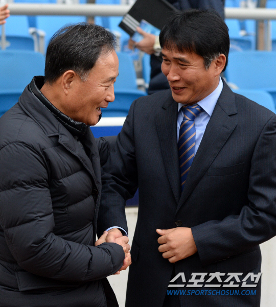 3일 인천 도원동 축구전용구장에서 K리그 클래식 35라운드 인천과 울산의 경기가 열렸다. 경기 전 울산 김호곤 감독과 인천 김봉길 감독이 인사를 나누고 있다. 인천=송정헌 기자 songs@sportschosun.com/2013.11.3