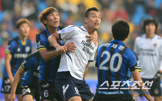 3일 인천 도원동 축구전용구장에서 K리그 클래식 35라운드 인천과 울산의 경기가 열렸다. 울산 김신욱을 온몸으로 막아서고 있는 인천 선수들. 인천=송정헌 기자 songs@sportschosun.com