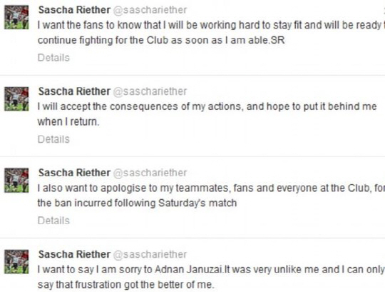 리에터는 6일(한국시각) 자신의 트위터를 통해 잘못을 인정하고, 야누자이와 팬들에게 직접 사과했다. '아드낭에게 미안하다고 말하고 싶다. 나같지 않은 행동이었다. 이런 절망감이 나를 더 나은 사람으로 만들어줄 거라는 말을 할 수 있을 따름'이라고 썼다. '오는 토요일부터 받게 될 출장정지 징계에 대해 동료들과 팬, 클럽의 모든 이들에게도 ''사과한다.' '내 행동으로 인한 결과를 겸허히 수용한다. 내가 돌아왔을 때는 새롭게 시작할 수 있길 바란다''다시 돌아올 때까지 더 열심히 운동할 것이고, 팀을 위해 싸울 수 있도록 최선을 다해 준비할 것이라는 점을 팬들이 알아줬으면 한다'고 덧붙였다.