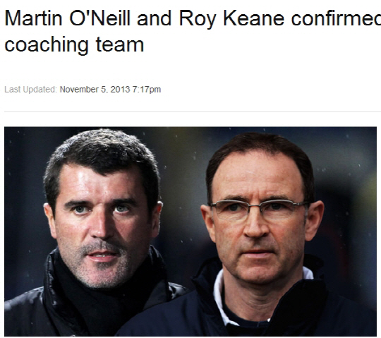 셀틱, 애스턴빌라, 선덜랜드 등을 이끌던 오닐 감독은 아일랜드 축구협회와 2년 계약에 성공했다. 이보다 앞서 킨은 수석코치 계약을 완료했다. 이들은 지난 9월 브라질월드컵 진출 실패를 이유로 경질된 지오반니 트라파토니 감독에 이어 아일랜드 대표팀을 이끌게 됐다. 이들은 15일 라트비아와의 친선경기에서 첫 선을 보인다.