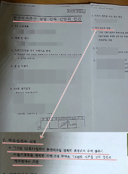 '한국여자축구 실업 감독 간담회 안건'이라는 타이틀의 이 문서는 인천전국체전기간중인 지난 19일, 감독 간담회에 참석한 A감독이 정리해 여자축구연맹 팩스로 보낸 2장짜리 문건이다. 사무국장, 사무총장의 사인이 첨부됐다. '농담'이나 '사담'이 아닌 정식 문서다. 9개의 의제 가운데 7번째 의제로 박은선이 언급됐다. '2013년 12월31일까지 출전여부를 정확히 판정하여주지 않을시 서울시청팀을 제외한 실업 6개구단은 14년도 시즌을 모두 출전을 거부한다는 의견'이라고 씌여 있다. 이미 수년째 리그에서 정상적으로 뛰고 있는 선수에 대해 출전여부를 정확히 판정해 달라고 요청했다. 출전거부를 언급하며 연맹을 압박했다. 6일로 예정된 단장회의에서 정식 안건으로 논의될 것으로 예상됐다. 이 문서대로 한 선수와 관련된 문제로 6개구단이 출전 거부를 운운했다는 문제는 심각하다. 리그 전체의 존폐를 위협하는 문제를 너무 쉽게 언급했다. 선수 인권은 물론 팬들에 대한 존중이 없었다는 비난을 피하기 어렵다.