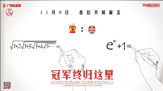 두 팀은 아시아챔피언스리그(ACL) 결승 1차전에서 2대2로 비겼다. 2차전에서 우승팀이 가려진다. 광저우는 자신감이 하늘을 찌른다. 홈 2차전에서 서울을 3대0으로 이긴다는 내용을 담은 그림이 구단 홈페이지의 대문을 장식했다. 두 구단의 이름과 엠블럼 밑에 제시된 수학 문제를 풀면 광저우가 서울을 3대0으로 완파할 것이라는 해답이 나온다. 광저우의 득점은 인도의 수학자 스리니바사 라마누잔이 3을 풀이한 수열이고, 서울의 득점은 스위스의 수학자 레온하르트 오일러가 증명한 공식이다.