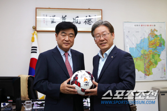 ◇지난달 22일 오후 이재명 성남시장과 권오갑 프로축구연맹 총재(왼쪽)가 전격 회동했다. 사진제공=한국프로축구연맹