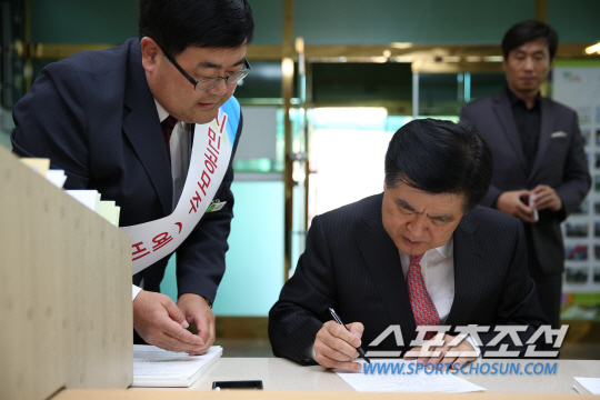 8일 오후 성남시 시흥동 주민센터에서 성남시민프로축구단 시민주 청약을 하고 있는 권오갑 프로축구연맹 총재