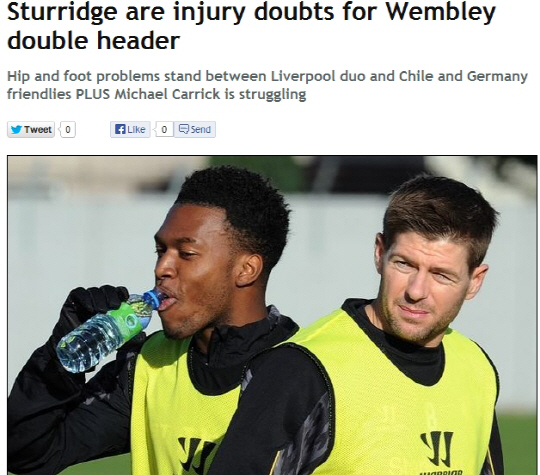 11일(한국시각) 영국 일간지 데일리미러는 스티븐 제라드와 다니엘 스터리지(이상 리버풀)이 칠레-독일과의 친선경기 2연전 출전이 불투명하다고 전했다. 제라드는 엉덩이, 스터리지는 발쪽이 좋지 않은 것으로 알려졌다. 브렌단 로저스 감독은 두 선수에 대한 체크가 필요하다고 했다. 그는 "주의깊게 살펴볼 필요가 있다. 스터리지는 발을 다쳤다. 메디컬팀과 함께 봐야 한다. 제라드는 엉덩이쪽에 통증이 있다"고 설명했다. 제라드는 일단 칠레전까지는 몸상태를 끌어올릴 수 있다는 긍정적인 반응을 보이고 있다.