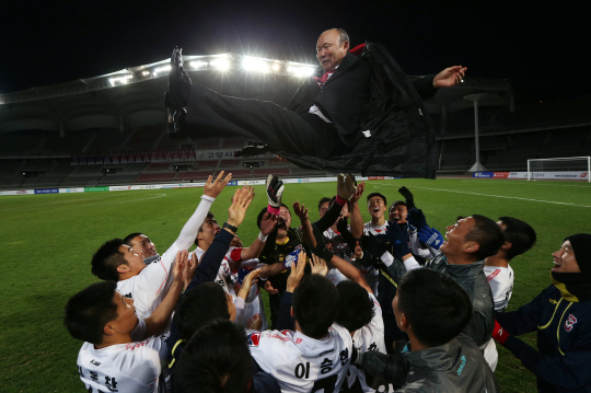 10일 고양종합운동장에서 열린 고양과의 챌린지 32라운드에서 3대2로 극적인 승리를 거두며 대망의 역전 우승에 성공한 상주 상무. K-리그 챌린지 초대 챔피언에 오른 상주가 또 다른 도전을 준비 중이다. 11연승의 K-리그 최다연승 기록 경신은 우승의 전유물이었다. 우승의 기쁨은 12일 전역하는 21명 선수들에게 선사한 선물이었다.
