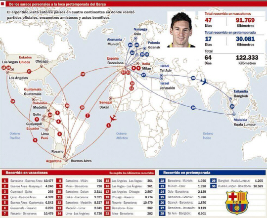 메시는 고향 방문차 바르셀로나에서부터 아르헨티나까지 1만 km를 날아간 것을 시작으로 개인 목적으로 약 9만2000km를 비행했다. 여기엔 남미와 미국에서 자신의 이름을 걸고 열린 세 차례 이벤트 경기도 포함돼 있다.
