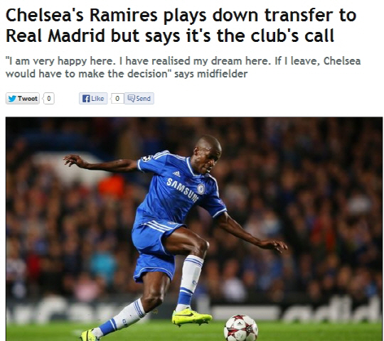 첼시 미드필더 하미레스의 말이다. 하미레스는 카를로 안첼로티 감독 부임 후 레알 마드리드의 지속적인 러브콜을 받고 있다. 그러나 하미레스는 13일(한국시각) 영국 일간지 데일리미러를 통해 레알 마드리드로 이적할 생각이 없음을 분명히 했다. 하미레스는 "레알 마드리드의 러브콜을 내가 유럽에서 잘하고 있다는 것을 보여주는 증거다. 그러나 나는 첼시와 계약이 남아 있다. 이적설에 대해 얘기하는 것은 비도덕적이다"며 "레알 마드리드 이적설은 소문일 뿐이다. 나는 첼시서 행복하다, 만약 내가 팀을 떠난다면 그것은 내가 아닌 첼시의 결정이다. 첼시는 세계에서 가장 큰 클럽 중 하나다. 나는 여기서 내꿈을 실현시켰다"고 했다. 이어 "잉글랜드 프리미어리그는 세계에서 가장 터프한 리그 중 하나다. 우리는 모든 대회에서 우승할 수 있다"며 첼시와 잉글랜드 무대에 대한 애정을 드러냈다.