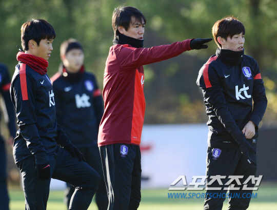 축구대표팀이 12일 오후 경기도 파주 축구트레이닝센터에서 소집 후 첫 훈련을 했다. 홍명보 감독이 선수들에게 훈련 지시를 하고 있다. 이날 소집된 홍명보호는 오는 15일 서울 상암에서 스위스와 평가전을 치른 후 19일 아랍에미리트 두바이에서 러시아와 원정 평가전을 치를 예정이다. 파주=정재근기자 cjg@sportschosun.com