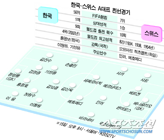 홍명보호가 15일 오후 8시 서울월드컵경기장에서 국제축구연맹(FIFA) 랭킹 7위 스위스(한국 56위)와 평가전을 치른다. 국내에서 열리는 올해 마지막 A매치다. 스위스는 더 이상 유럽 축구의 변방이 아니다. 브라질월드컵 유럽지역예선 E조에서 7승3무를 기록, 조 1위로 본선 티켓을 거머쥐었다. 세계 정상급의 FIFA 랭킹으로 월드컵 톱시드에 배정되는 기쁨도 누렸다.