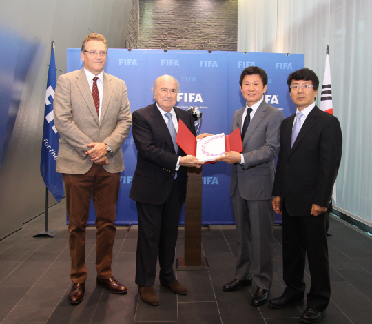 정몽규 대한축구협회장은 2017년 국제축구연맹(FIFA) 청소년월드컵(20세 이하) 유치신청을 위해 14일 오후 스위스 취리히에 있는 FIFA본부를 방문했다. 이 자리에서 정 회장은 제프 블래터 FIFA회장과 만나 비드북(유치신청서) 및 개최협약서를 제출하고 한국 개최의 당위성을 설명했다. 블래터 회장은 "한국이 2002년 한-일 월드컵, 2007년 청소년월드컵(17세 이하)에 이어 2017년 청소년월드컵을 유치 신청을 했는데 7은 한국에 굉장히 좋은 숫자인 거 같다. 이번 월드컵 유치 신청에도 관심을 가져주고 정 회장이 직접 방문해줘서 고맙게 생각한다. 항상 국제 축구에 적극적으로 동참해줘 감사한다"고 화답했다. 제롬 발케 사무총장도 "한국은 이번 개최 신청국중 가장 강력한 후보 중 하나"라고 했다.