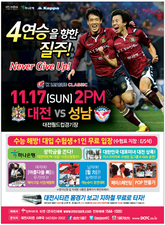 대전이 이번 성남전에서 승리한다면 최근 불붙은 강등권 탈출에 가속도를 낼 수 있다. 대전 선수단은 지난 대구전 엄청난 열기를 뿜어냈던 1만여 명 홈 팬들의 응원을 떠올리며 이번에도 반드시 홈 승리를 거둬 팬들에게 보답한다는 각오다.