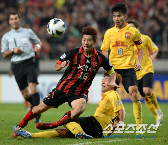 FC서울과 광저우 에버그란데(중국)의 아시아축구연맹(AFC) 챔피언스리그 결승 1차전이 26일 서울월드컵경기장에서 열렸다. 하대성이 김영권의 수비에 걸려 넘어지고 있다. ACL 우승팀에는 상금 150만달러(약 15억9000만원)와 함께 세계 최고의 클럽을 가리는 클럽월드컵 출전권이 주어진다. K리그는 최근 5년 연속 ACL 결승에 올랐다. 포항(2009년), 성남(2010년), 울산(2012년)이 우승컵에 입맞춤했고, 전북(2011년)은 아쉽게 준우승을 차지했다. 상암=허상욱 기자 wook@sportschosun.com/2013.10.26/
