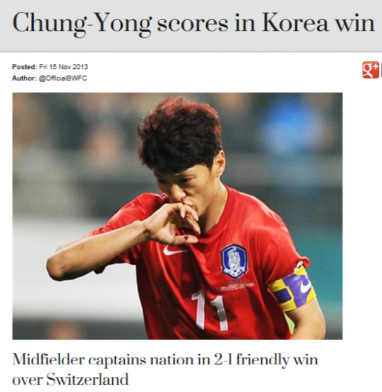 볼턴 구단은 홈페이지를 통해 16일(한국시각) '한국 대표팀의 주장으로 나선 이청용이 스위스와의 친선경기에서 2대1의 승리를 이끄는 결승골을 기록했다'고 보도했다. 자세한 골 장면과 함께 한국팀의 러시아 친선경기 일정까지 전했다.