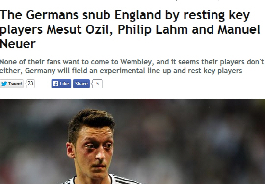 미러지는 '독일이 위크엔드팀을 웸블리에 파견한다'고 썼다. '이는 잉글랜드와 영국축구협회(FA)를 무시하는 처사'라고 비난했다.