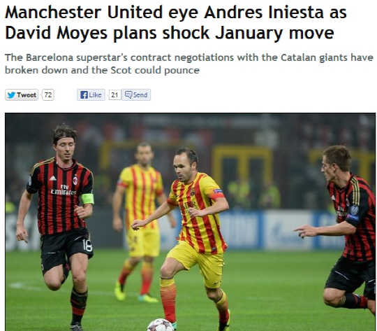 18일(한국시각) 영국 일간지 데일리미러는 창의적인 미드필더 보강을 노리는 데이비드 모예스 감독이 이니에스타의 상황을 주시 중이라고 보도했다. 모예스 감독은 1월 이적시장에서 특급 미드필더를 영입해 상황을 반전시키고 싶어한다. 영입만 할 수 있다면 이니에스타는 그 적임자다.