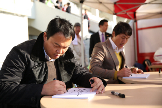 유상철과 이운재는 지난 16일 상주의 K-챌린지 초대 우승 현장 시상식이 거행된 챌린지 33라운드 상주-광주경기를 찾아 경기전 사인회, 하프타임 미니 인터뷰, 월드컵 영웅 포토타임 등을 통해 축구팬들을 만났다.