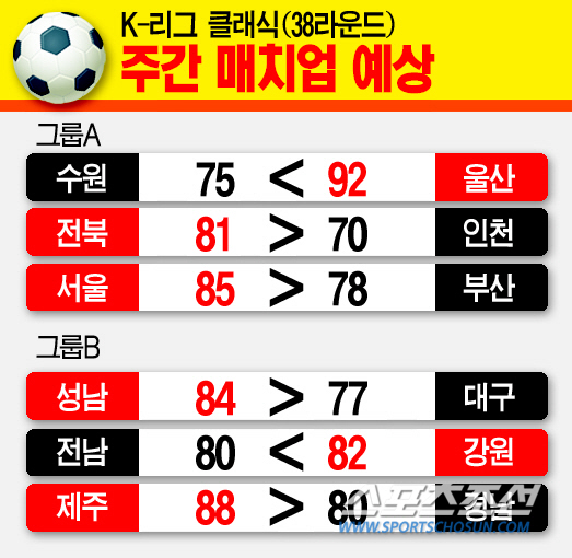 K-리그 클래식 우승 경쟁과 아시아챔피언스리그(ACL) 티켓 획득, 그리고 강등을 두고 순위 싸움을 펼치고 있는 그룹A 1위~5위팀과, 그룹B 10위~14위 팀의 경기수가 클래식 38라운드를 기점으로 동일해진다. 이에 앞서 전북과 서울이 20일 맞대결을 펼치면서 경기수가 같아진다. 38라운드가 지나면 10개 팀이 모두 36경기의 성적표를 받아든다. 종착역까지 2경기씩을 남겨두고 각자의 목표를 향해 다시 달린다. 시선은 제각각이다. 울산과 포항은 우승 경쟁을, 전북과 FC서울, 수원은 ACL 출전권을 두고 다툰다. 10위 전남(승점 37)부터 경남(11위·승점 32·골득실차 -14) 강원(12위·승점 32·골득실차 -29) 대구(13위·승점 29) 대전(14위·승점 28)은 강등 탈출에 시선이 쏠려 있다. 38라운드에서 2위 포항(승점 68)과 14위 대전은 잠시 쉬어간다. 11월 넷째주 '스포츠토토 주간 프리뷰 파워랭킹'은 각 팀들의 운명을 가를 클래식 38라운드를 분석했다.