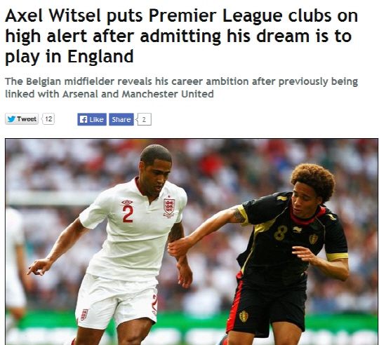 또 한명의 벨기에 선수가 EPL로 이적할 것인가. 벨기에의 미드필더 악셀 비첼(제니트)가 EPL 구단들에 러브콜을 보냈다. 18일(한국시각) 일본과의 친선경기를 앞두고 기자회견에 나선 비첼은 잉글랜드로 이적하고 싶다는 뜻을 밝혔다. 그는 "잉글랜드는 내 목표다. 나는 당장 이적하겠다고 하는 것이 아니다. 언제 벌어질지는 나도 모른다. 그러나 톱클럽이어야 한다"고 했다.