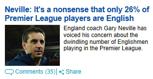 맨유의 레전드 개리 네빌이 잉글랜드 프리미어리그(EPL)에 뛰고 있는 자국 선수 비율이 줄어들고 있는 것에 대한 심각한 우려를 드러냈다. 영국대표팀에 선발될 수 있는 선수풀이 그만큼 한정적이라는 이야기다. 독일전에서 0대1로 패한 후 성인대표팀과 프리미어리그의 미래에 대한 우려를 표했다.