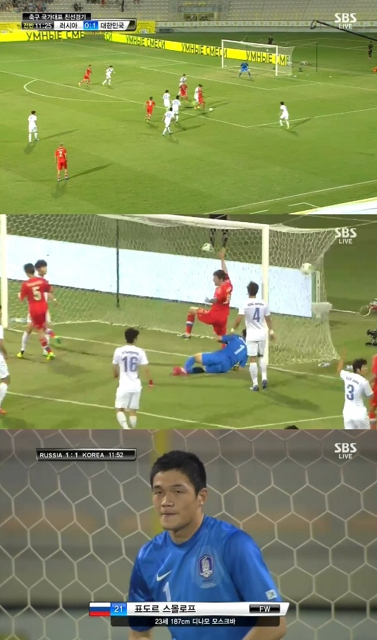 로만 시로코프가 페널티지역 오른쪽에서 강하게 찬 땅볼 크로스를 정성룡이 몸을 날리며 막으려 했지만 공은 정성룡의 오른손을 맞고 튀어나갔다. 이때 뒤에서 쇄도하던 피오도르 스몰로프가 텅빈 골대를 향해 동점골을 터트렸다.